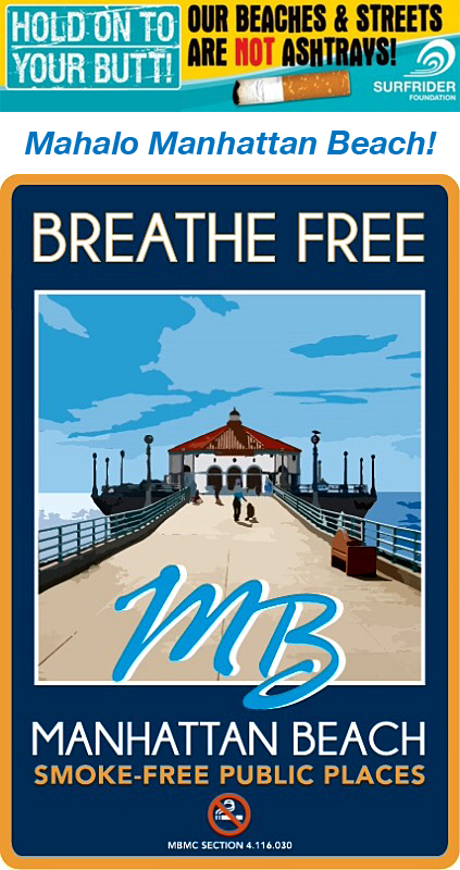 The Surfrider Foundation South Bay Chapter worked closely with the City of Manhattan Beach to encourage adoption of advanced smoking ordinances that not only help to protect the health and wellbeing of residents, visitors, and our members, but also help to significantly reduce the amount of cigarette waste litter leading to a cleaner and healthier environment, in realization of Surfrider's Mission to protect and enjoy our oceans, waves, and beaches.